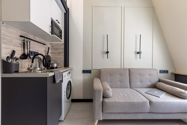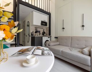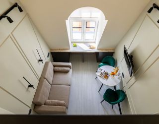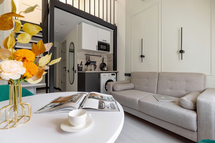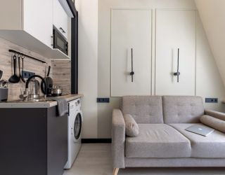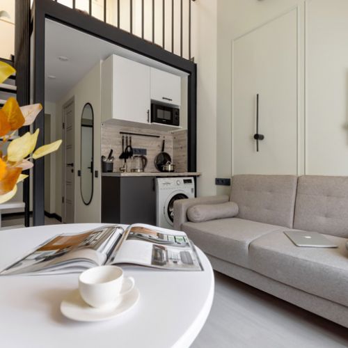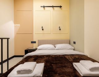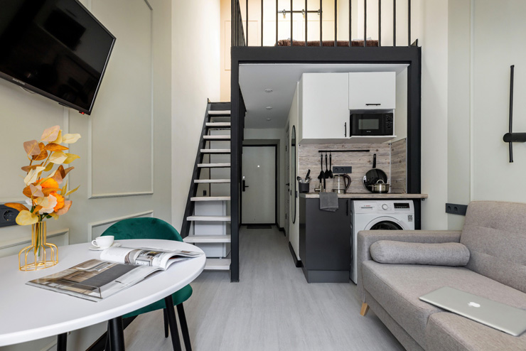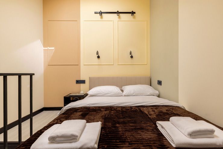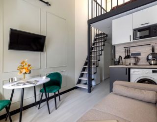 В апартаментах могут разместиться до 4 гостей. Нижний уровень оснащен раскладным диваном, функциональной мини-кухней со стиральной машиной, обеденной зоной со столом и мягкими стульями. Второй ярус отведен под 2 спальных места. В компактном совмещенном санузле установлен душ. Постояльцы могут подключиться к Wi-Fi.