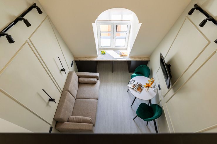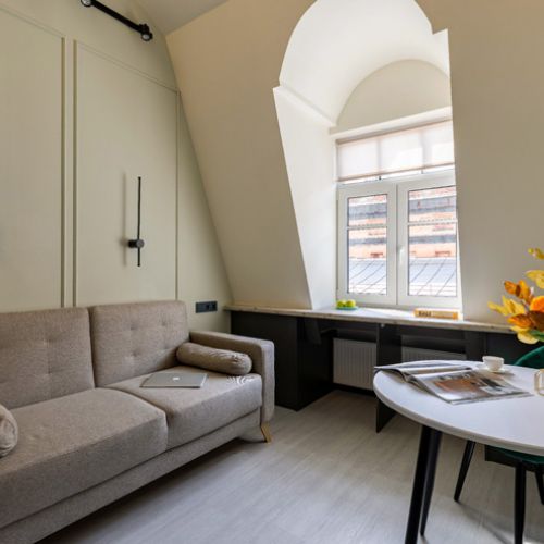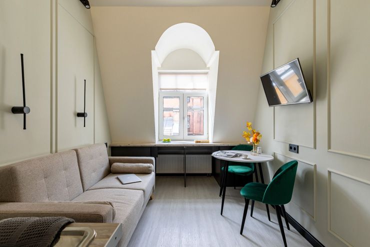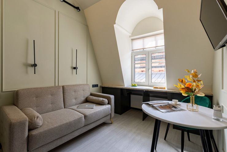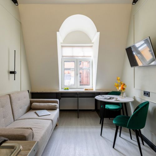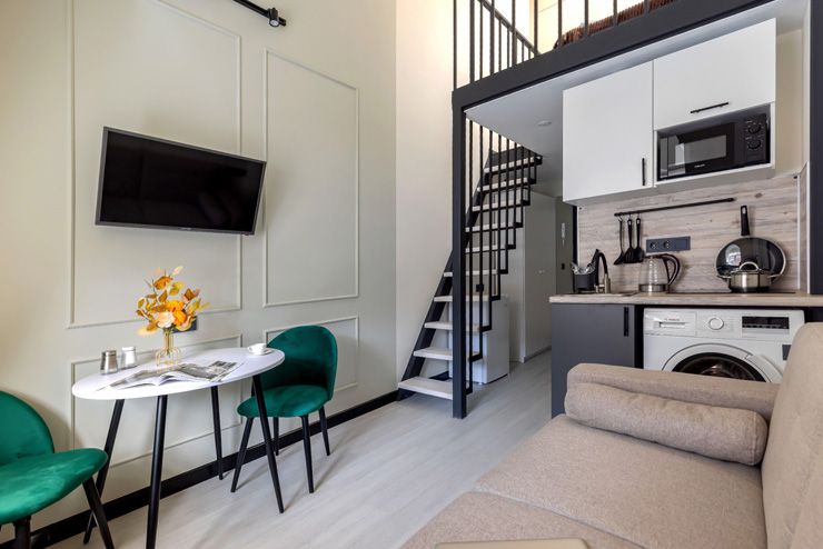 Уютные двухуровневые апартаменты располагаются в историческом здании — бывшем доходном доме Кисилева. Рядом оборудованы спортивная площадка и футбольное поле. Напротив открыты антикафе, пивная, баня.